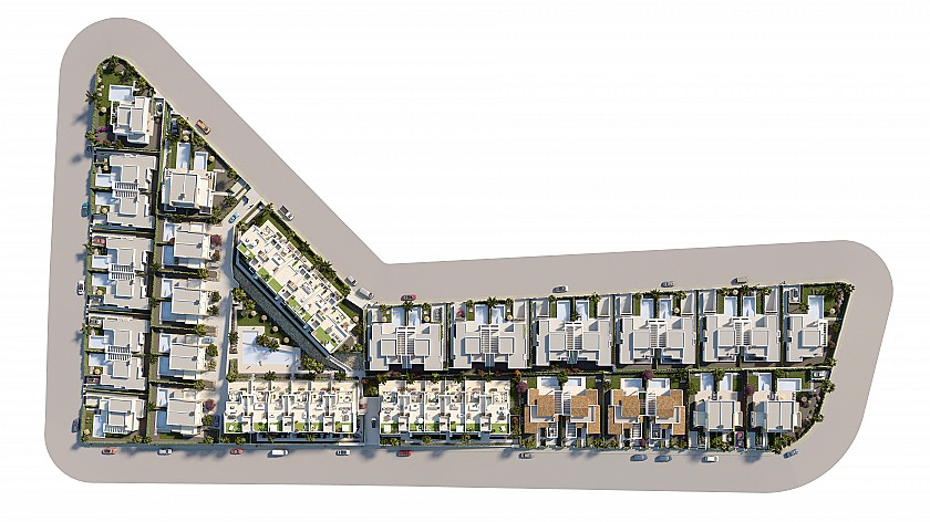 Här kommer det även byggas rymliga radhus och vackra villor med privata pooler.