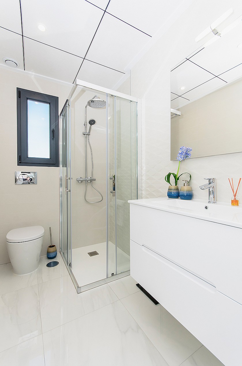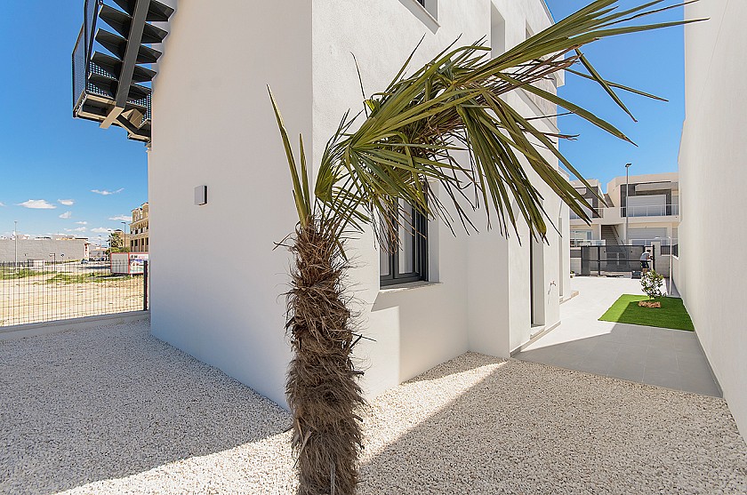 Dessa vackra villor är beläget på stora tomter med privat pool med utomhus dusch och här finns det gott om utomhus ytor att njuta på. Villorna har tre sovrum samt tre badrum varav två är en-suite model. Alla badrummen har golvvärme som standard. På första våningen har ni ett stort och ljust vardagsrum med kök i öppen planlösning. Här finns även det första sovrummen och ett komplett badrum. Trappen upp leder er till två sovrum med både ensuite badrum och varav master sovrummet har utgång till en stor terrass.