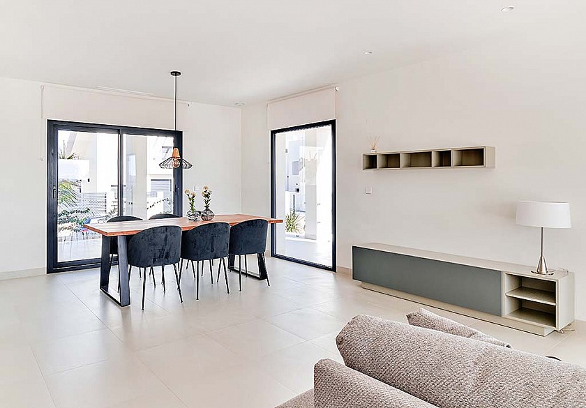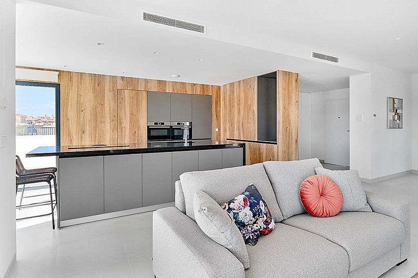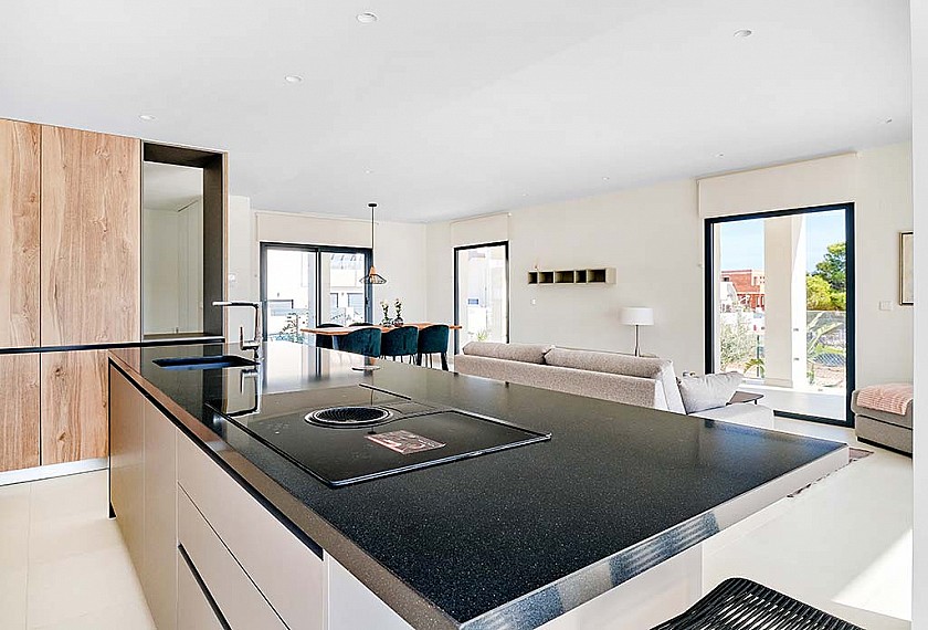 Vardagsrummen har stora fönsterpartier för att maximalt ljusintag samt en underbar utsikt över den privata poolen. Köket är fullt utrustat med material av högsta kvalitet, modern design och en köksö som ger stora arbetsytor i den öppna planlösningen.