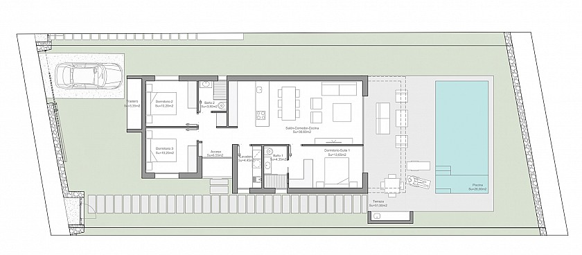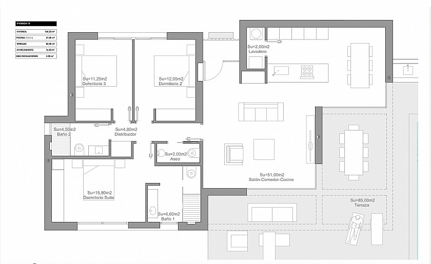 Vardagsrummen har stora fönsterpartier för att maximalt ljusintag samt en underbar utsikt över den privata poolen. Köket är fullt utrustat med material av hög kvalitet, modern design och en köksö som ger stora arbetsytor i den öppna planlösningen.