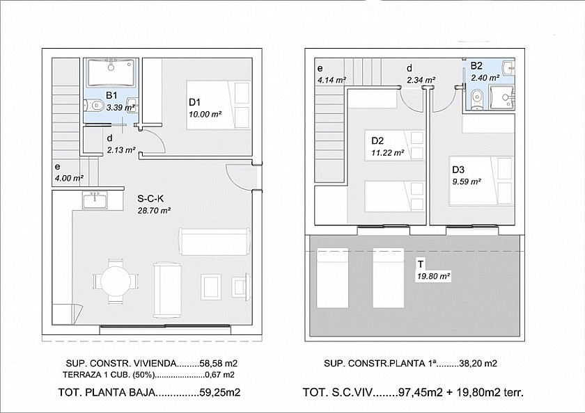 Samtliga villor är fördelade på två plan med tre sovrum och två badrum samt möjlighet att välja till takterrass.