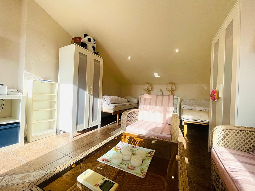Välkomna in genom grinden till detta fina radhus och ni välkomnas av en stor tomt. Själva markplan består av två sovrum , rymligt vardagsrum och kök som är i bra skick samt ett komplett badrum. På ovanvåningen vid takterrassen som ni når från dörren vid köket har ni det tredje sovrummet.