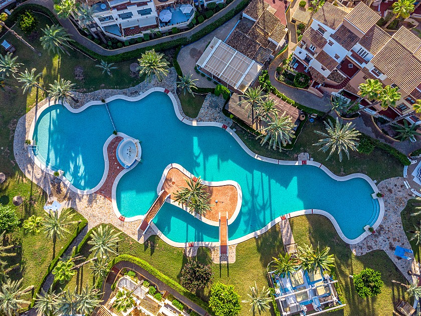Området är byggt i charmig medelhavsstil med vitkalkade fasader, färgglada detaljer och små stigar som slingrar sig genom gröna gemensamma områden med palmer och blommor. Många av bostäderna har stora terrasser och balkonger med utsikt över trädgården, poolen eller havet.